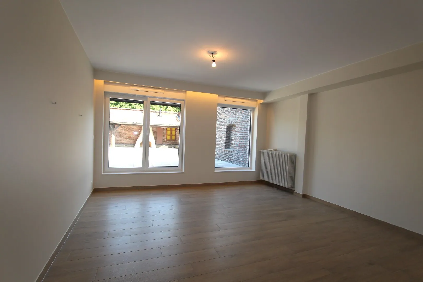 x riante woonkamer met aanbouwkasten en sierhaar achteraan; vooraan grote ramen met zicht op het Hospitaalplein;