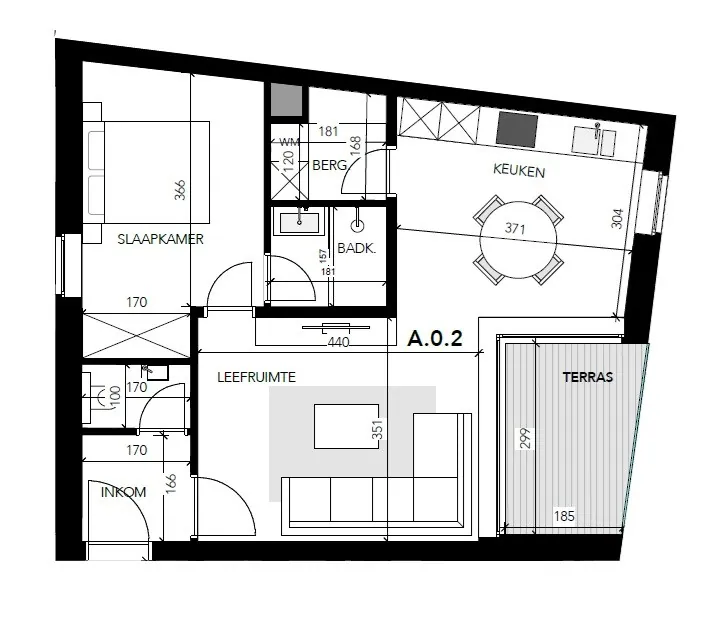 INDELING: inkomhal, apart toilet, woonkamer met terras, ingerichte keuken. Naast de keuken een berging/wasplaats. Er is 1 ruime slaapkamer met aansluitend de badkamer met inloopdouche en lavabomeubel.
