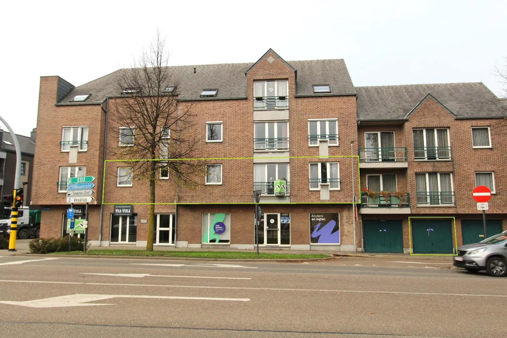 Rechts aan de gebouw zijn er 3 garages, waarvan 1 horende bij het appartement