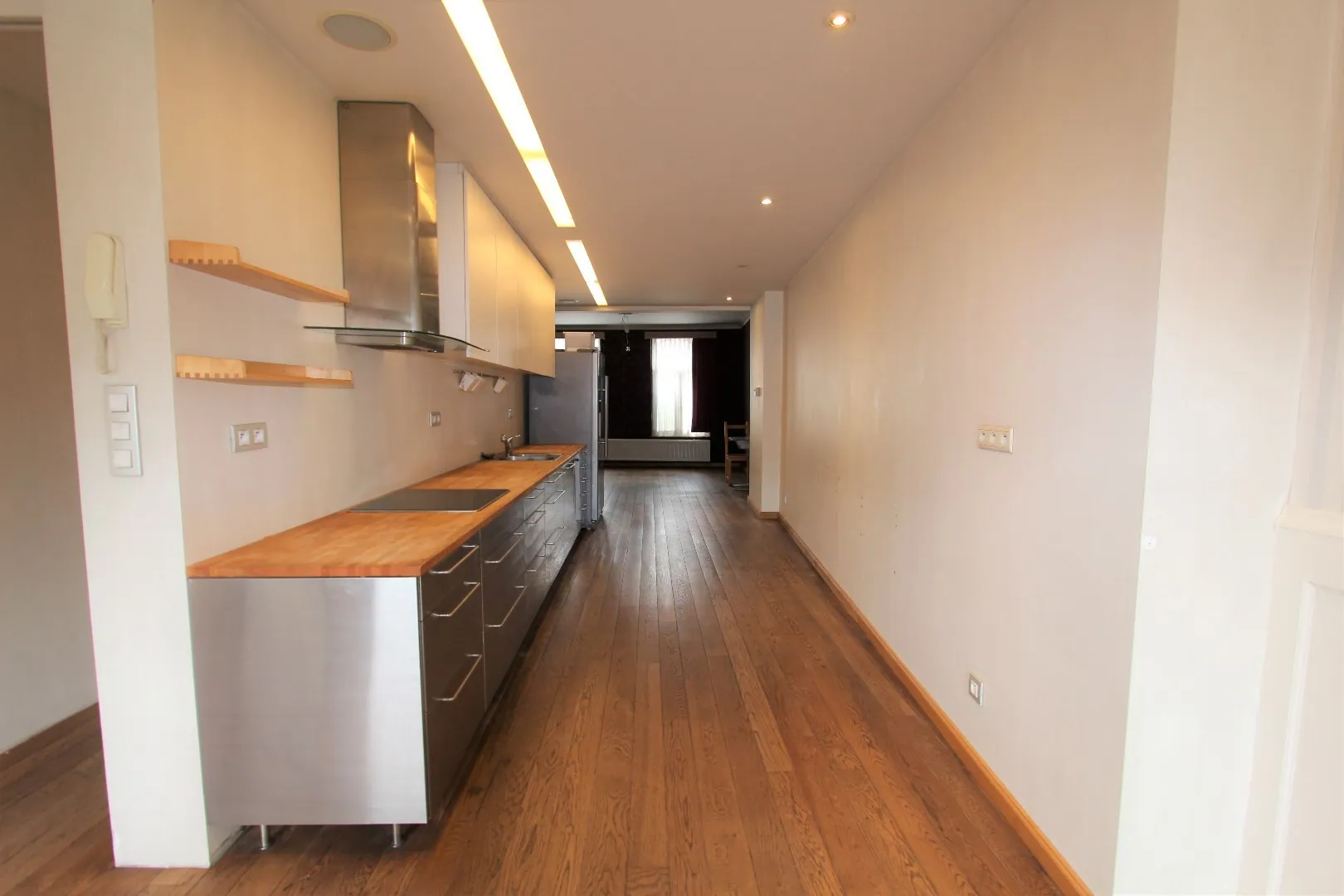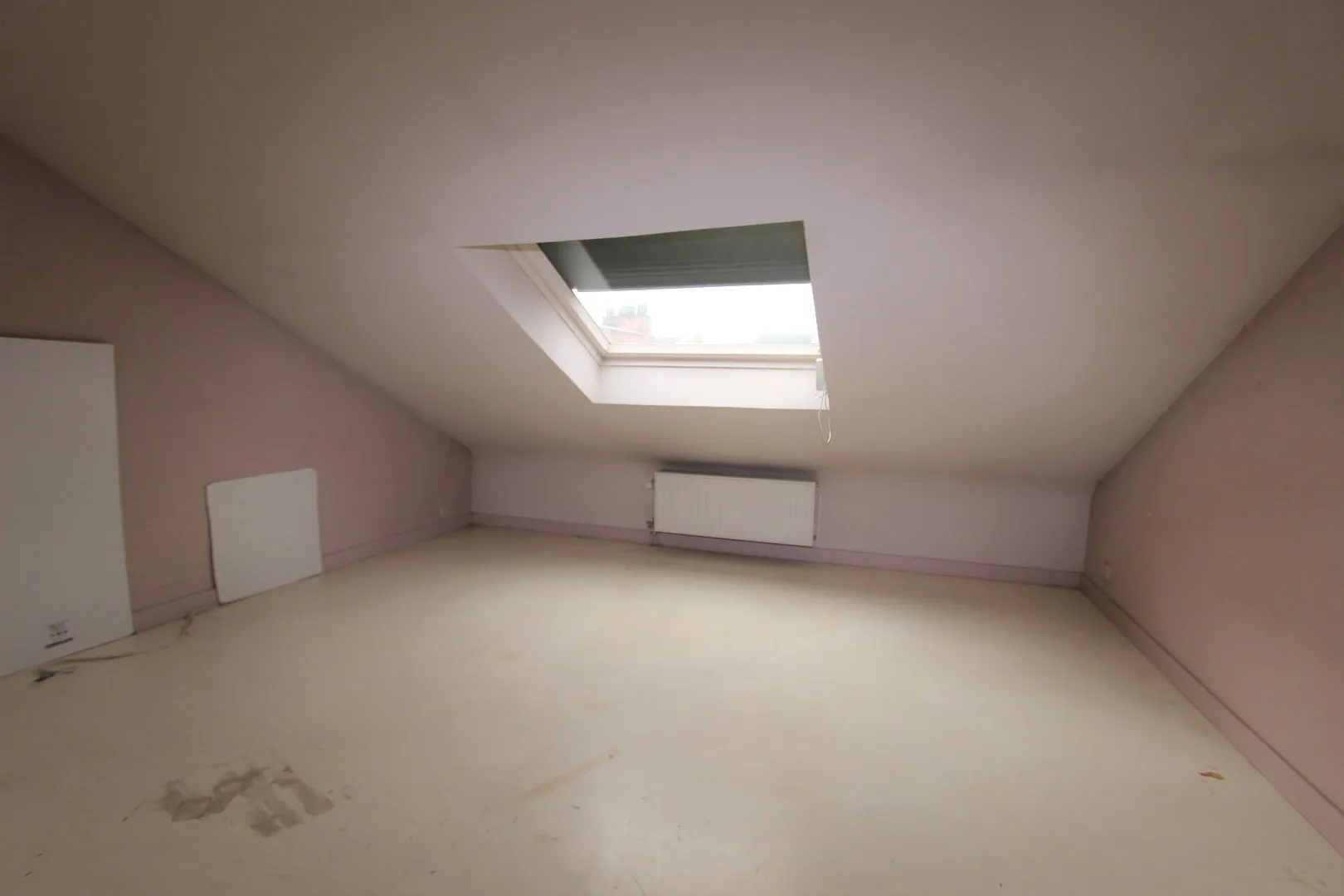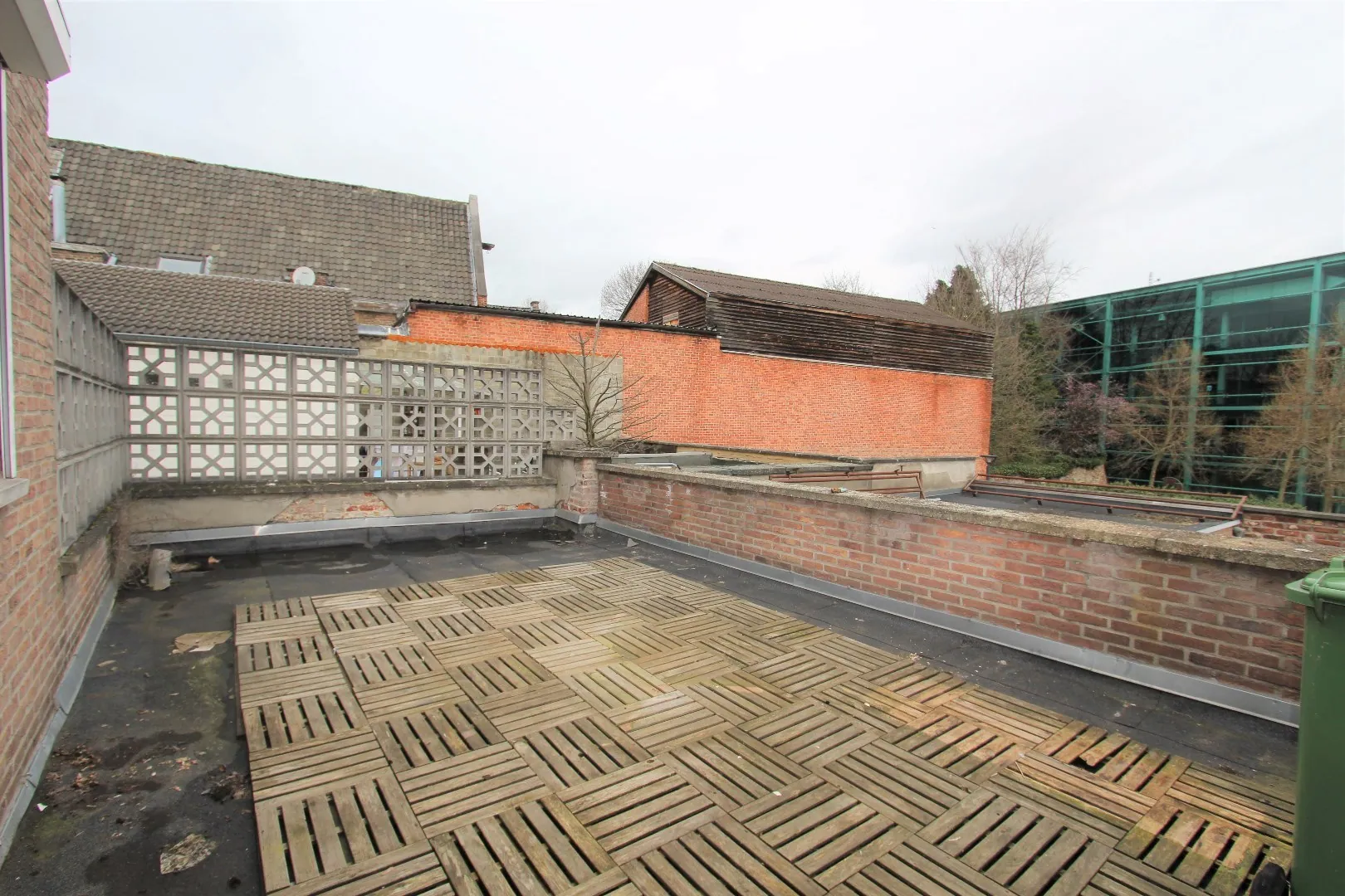 Het bovengelegen appartement heeft op het eerste verdiep een moderne open keuken, zithoek met parketvloer en groot dakterras. Op de tweede verdieping 2 slaapkamers, waarvan 1 met grote muurkast, en badkamer. Op de derde verdieping een polyvalente kamer en bergkamer.