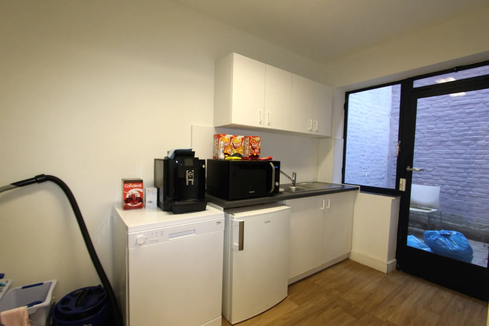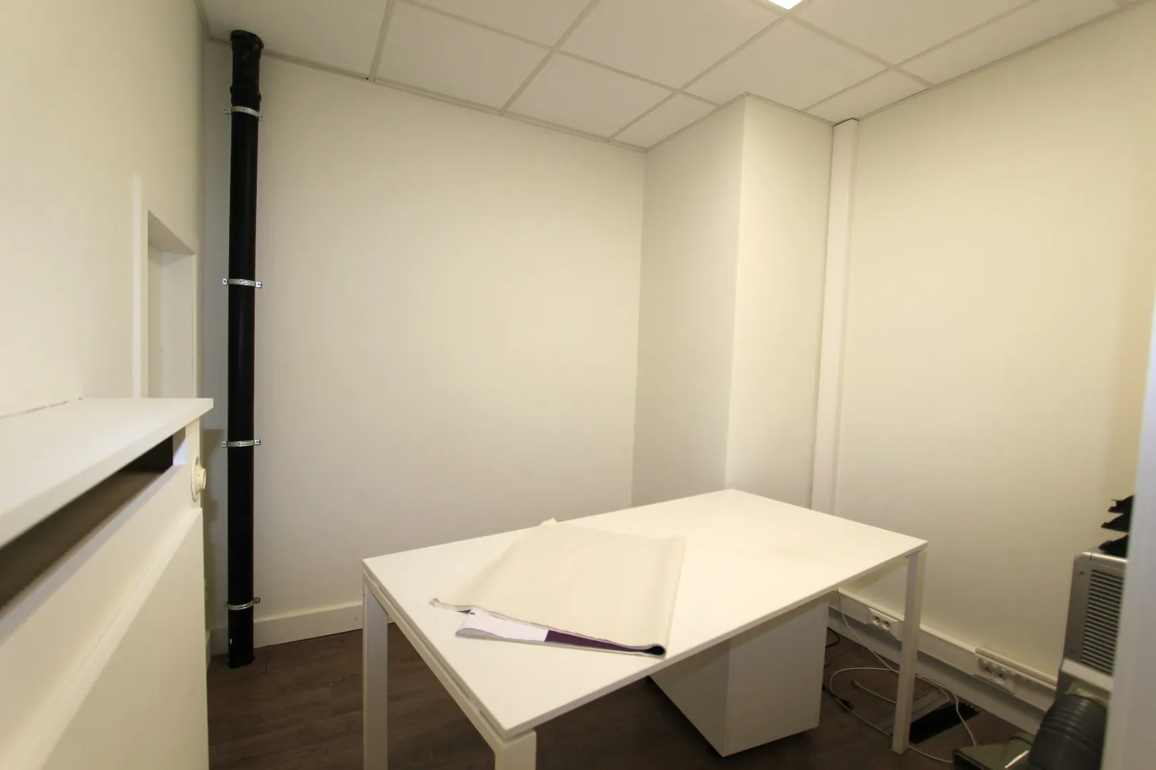 INDELING: Ruime winkel- of kantoorruimte met grote ramen vooraan, hierachter nog een ruimte met toegang naar de andere vertrekken. Er is een apart toilet en kleine badkamer met ligbad en lavabomeubel. Verder zijn er 3 aparte kamers, te gebruiken als stockage, archief of aparte burelen,.. Achteraan een keukentje met toegang naar een kleine koer.
