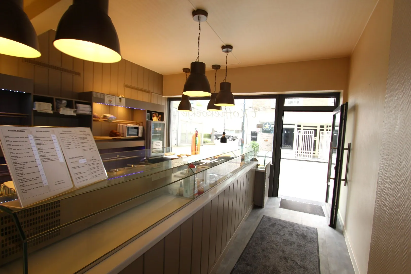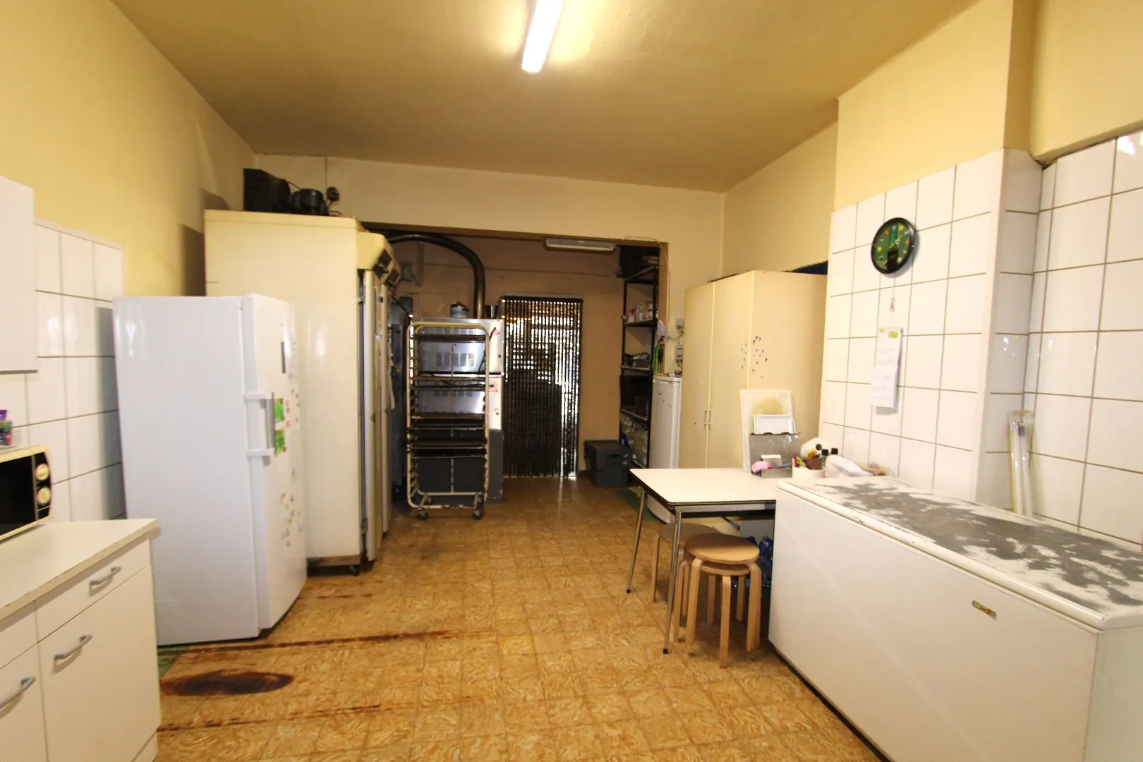INDELING: inkom in de winkelruimte van +- 25 m², een grote (keuken)ruimte met toegang tot de overdekte koer (20m²), twee polyvalente kamers of stockruimten. In de laatste kamer staat momenteel een koelcel (van de huidige huurder).