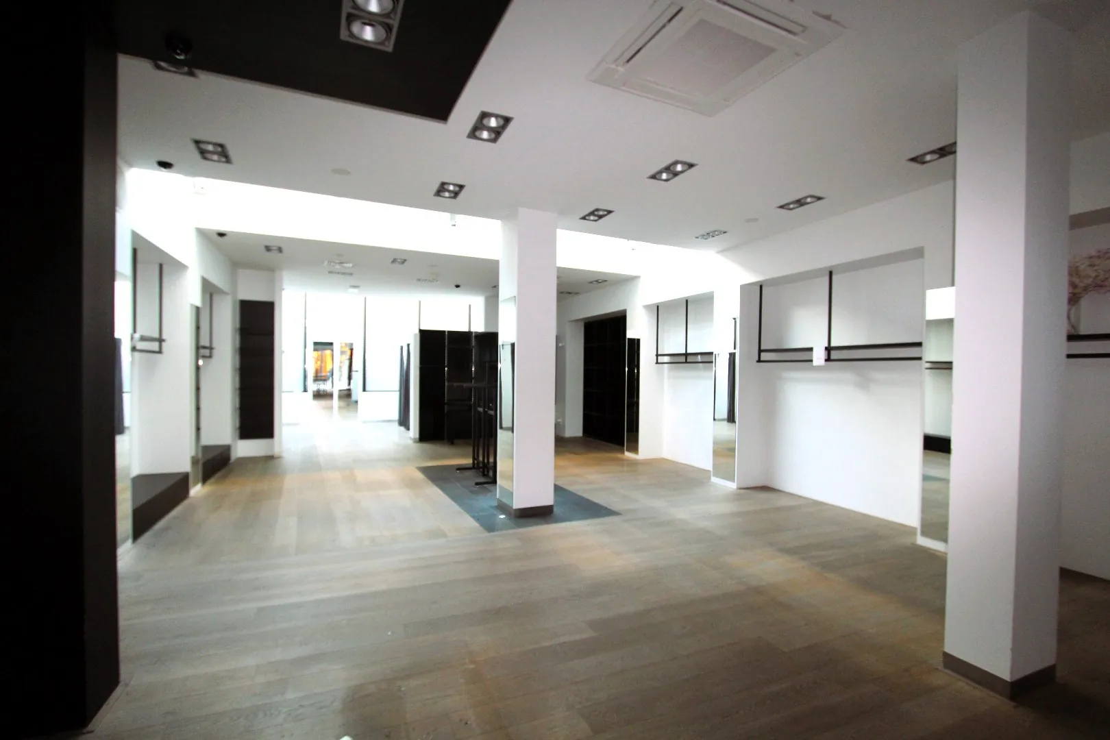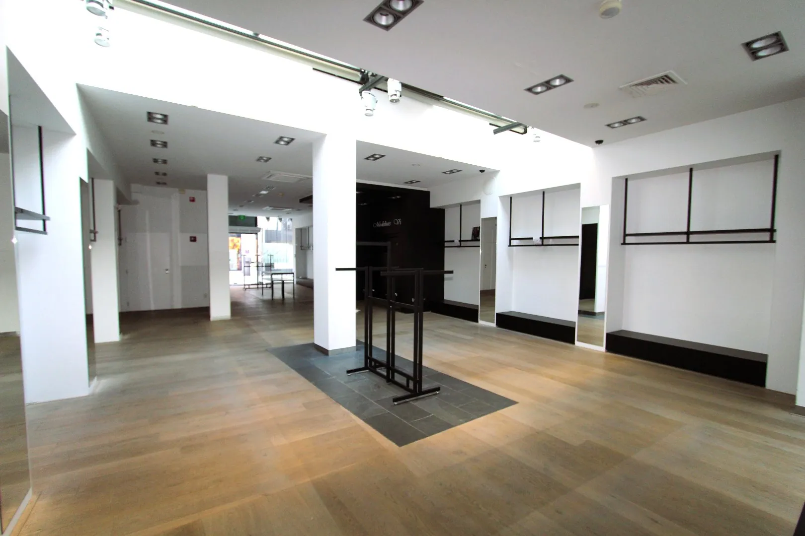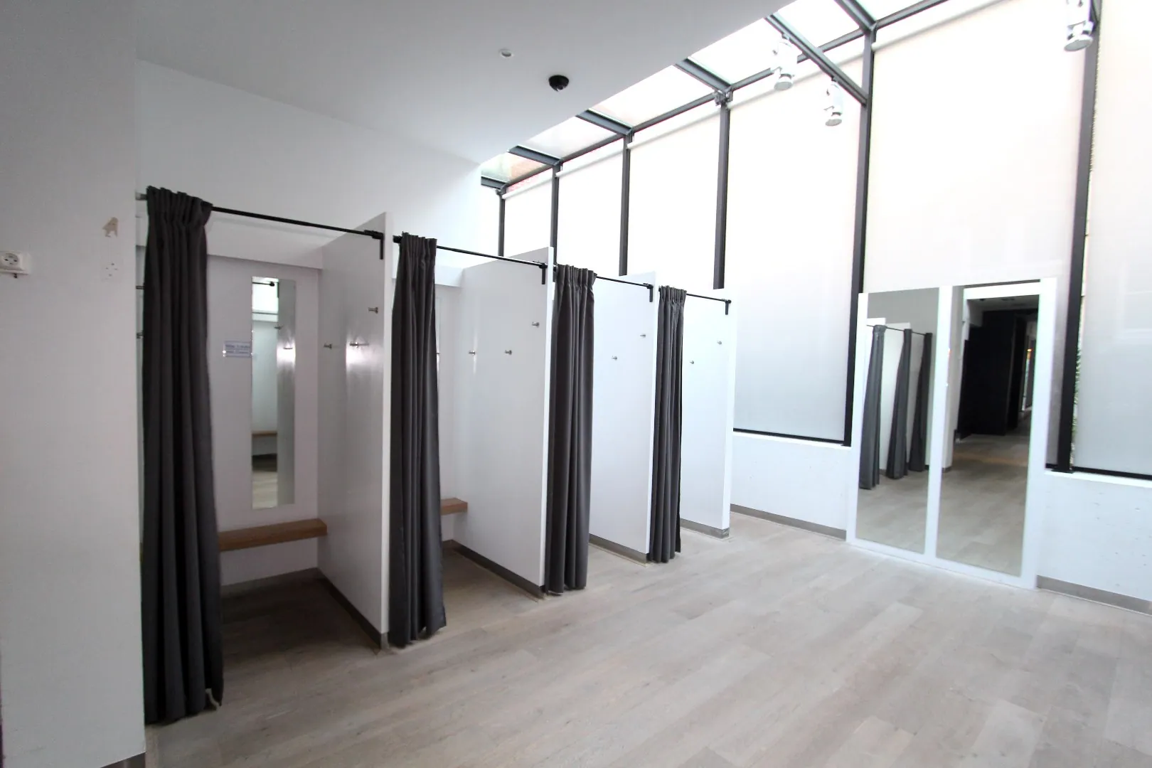 De winkelruimte is voorzien van een prachtige parketvloer, ingebouwde kasten, ingebouwde verlichting, airco, .. Alles afgewerkt met hoogwaardige materialen. Achteraan zijn er 7 paskamer. Veel lichtinval door de hoge ramen aan de achterzijde.