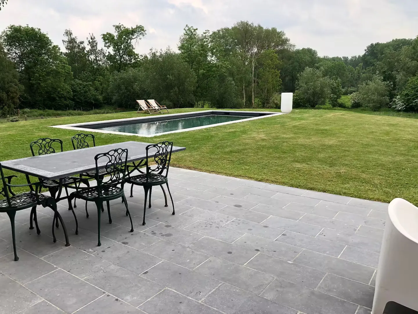 Er is een enorme tuin met terras, zwembad en tuinhuis.