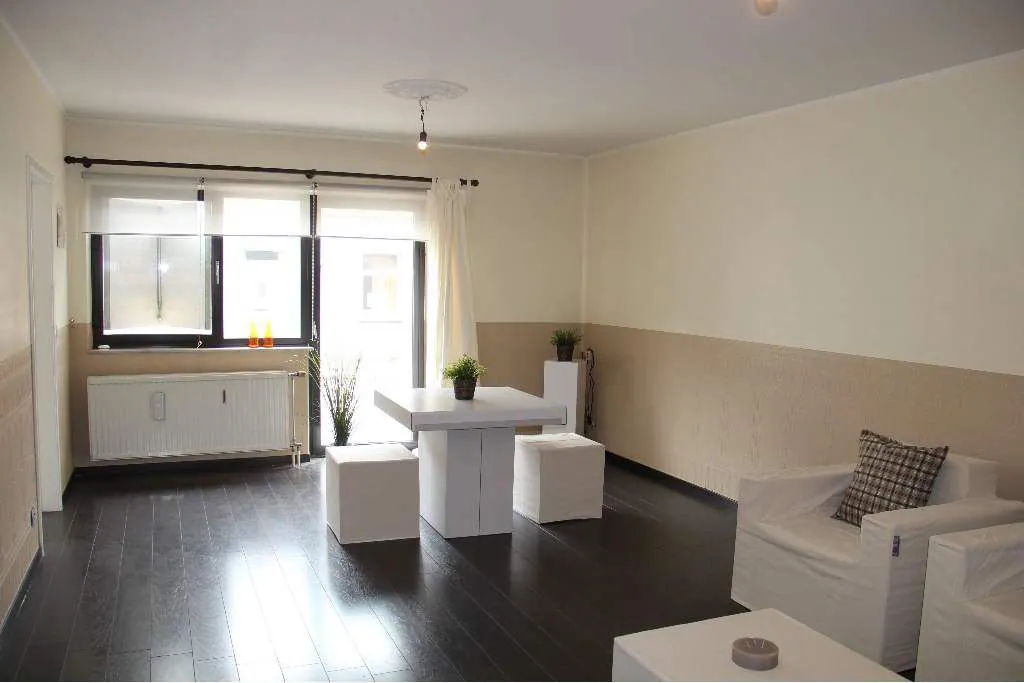 INDELING: inkomhal met vestiaire, mooie woonkamer aan de voorzijde met nieuwe laminaatparket en goede lichtinval, aparte keuken, volledig nieuw ingericht.