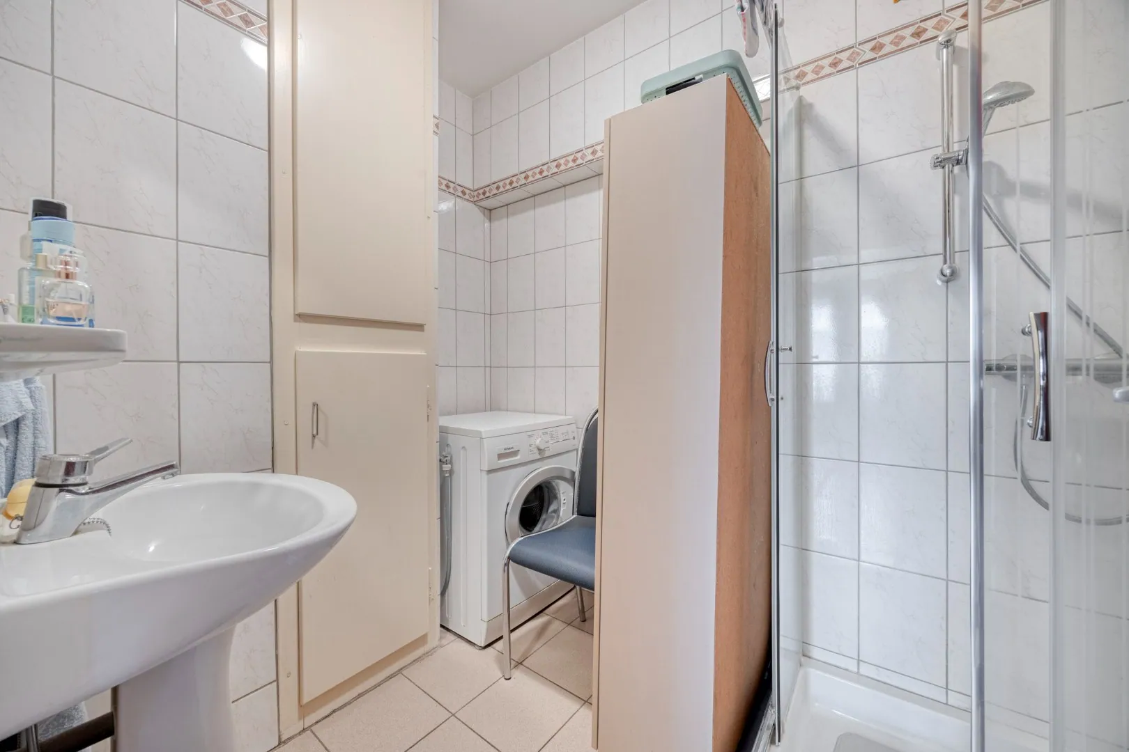 x badkamer met douche, lavabo en aansluiting wasmachine.