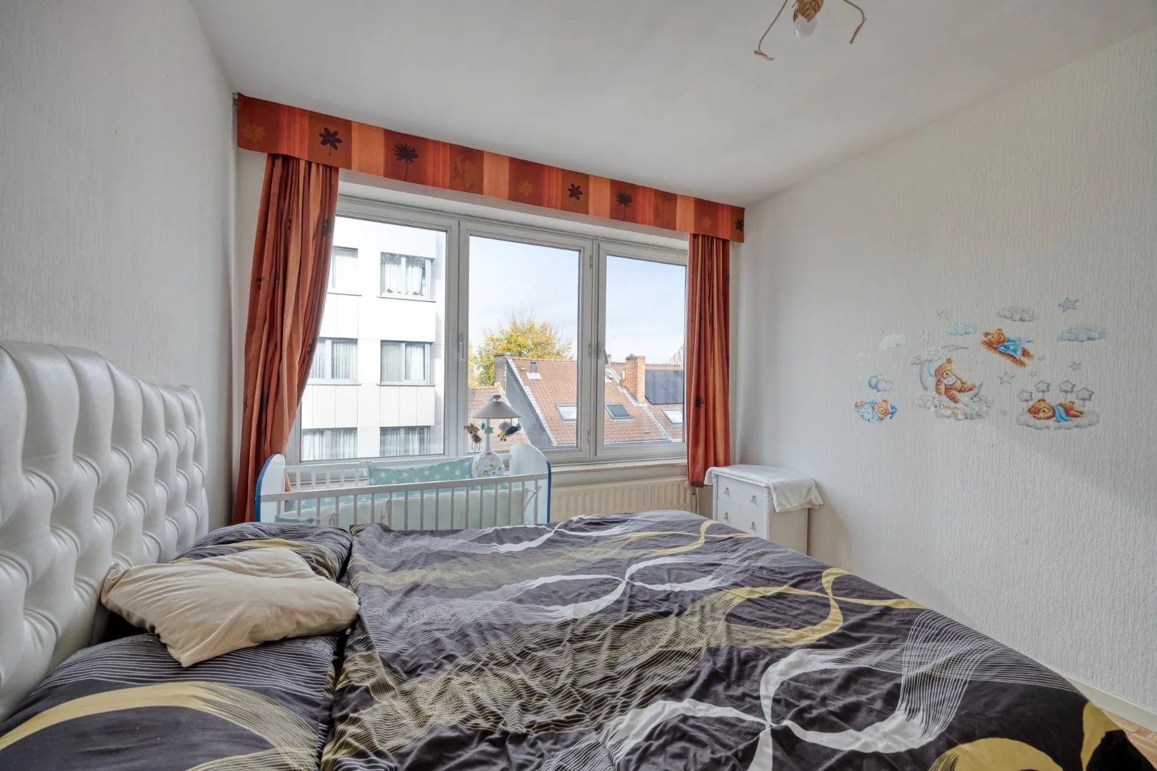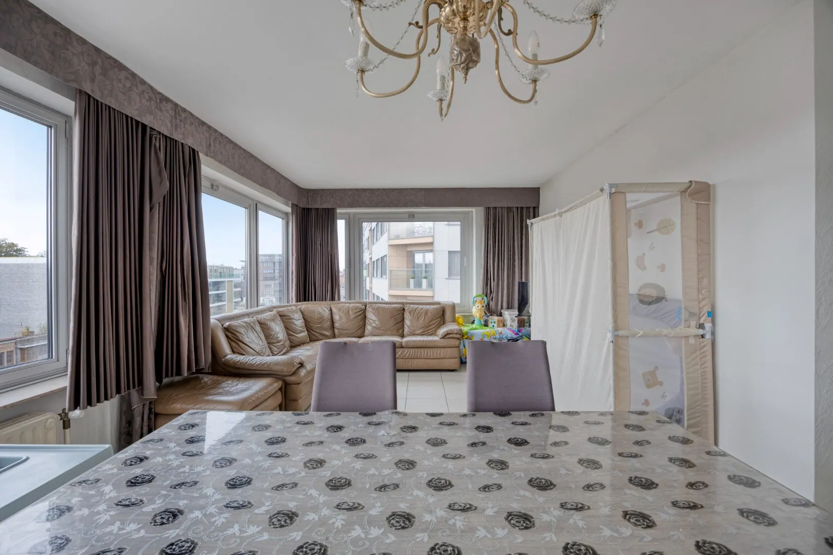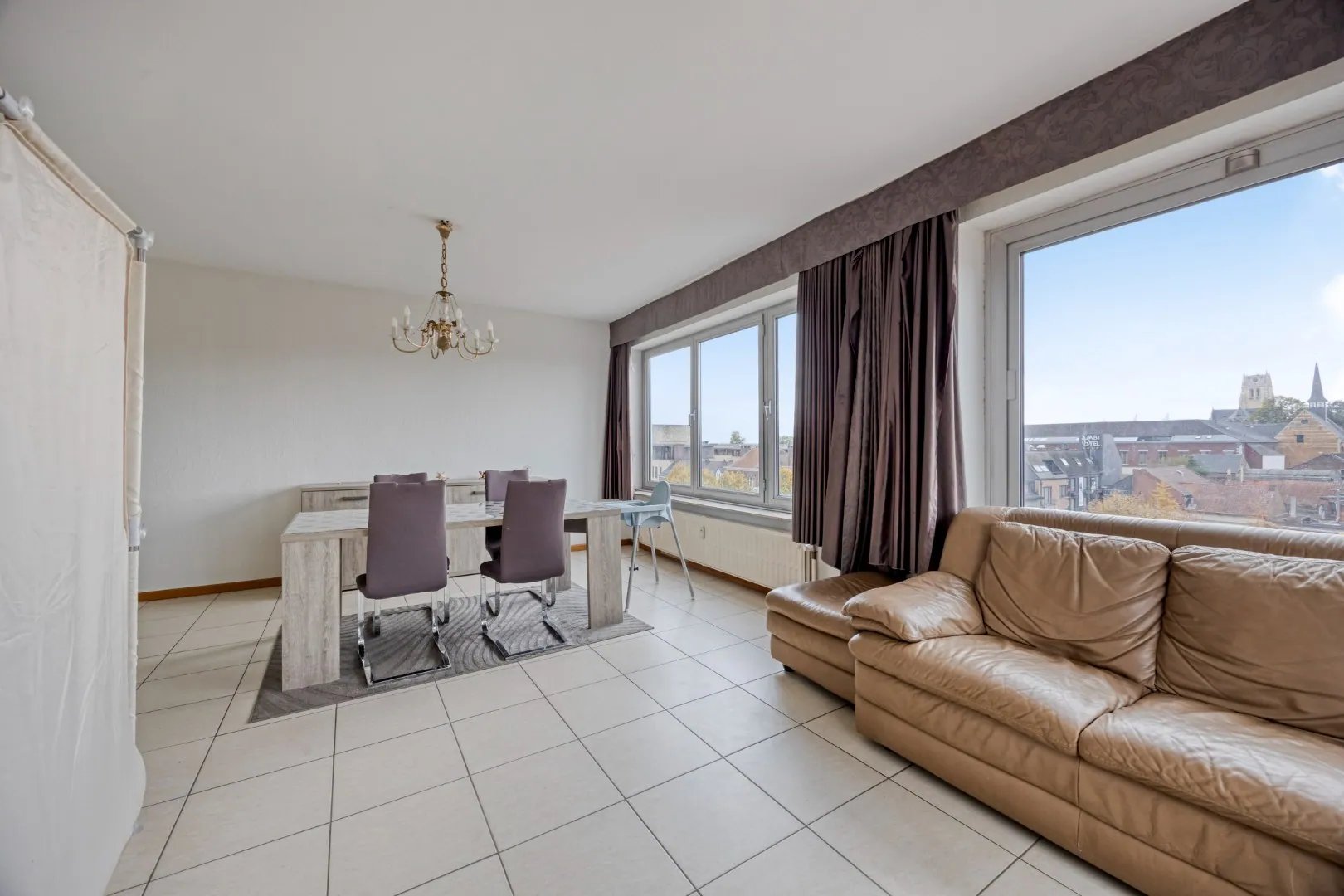 x ruime woonkamer op de hoek; de grote ramen aan 2 gevels zorgen voor een prachtig zicht over de stad en een ideale lichtinval;