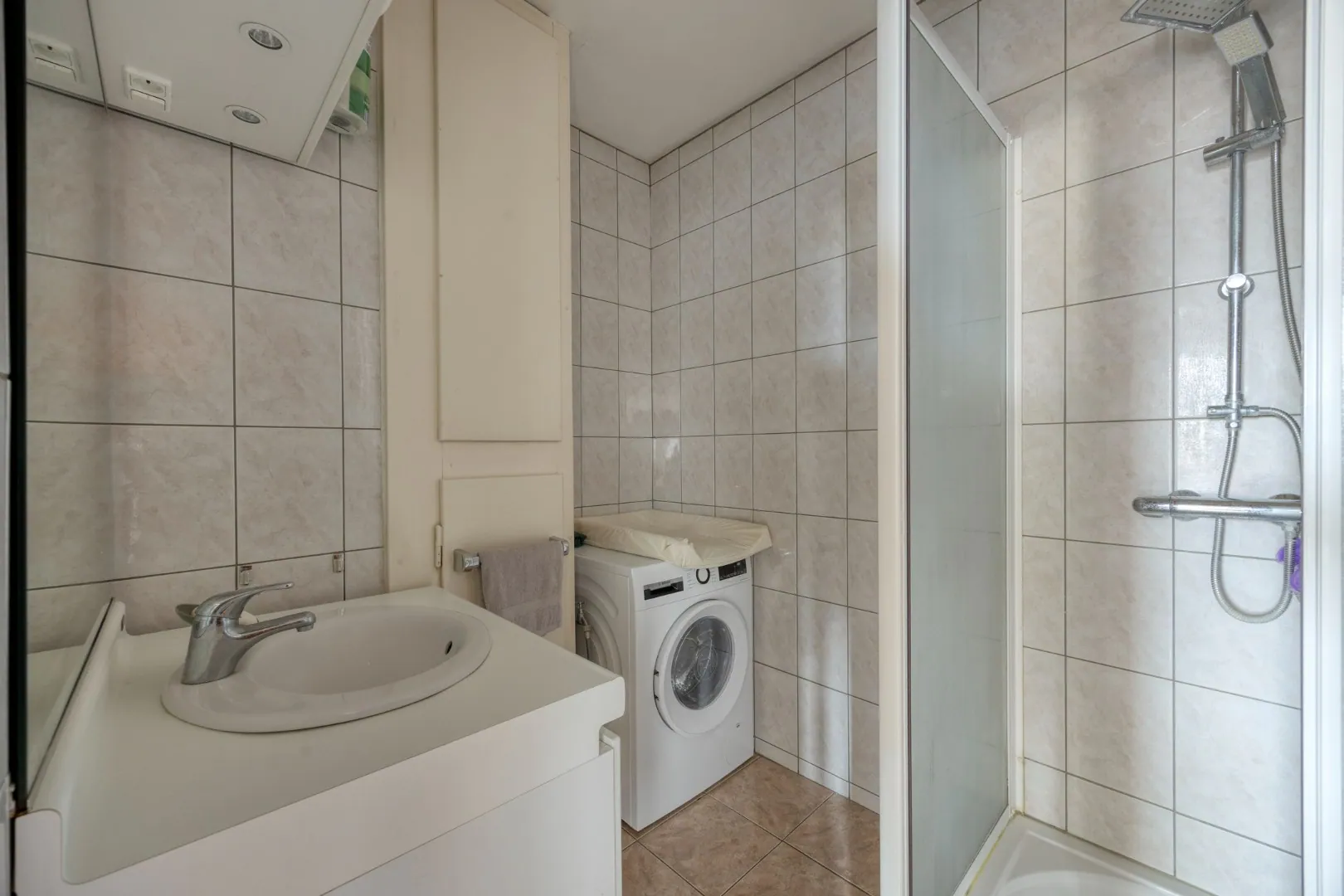 x badkamer met douche, lavabo en aansluiting wasmachine.
