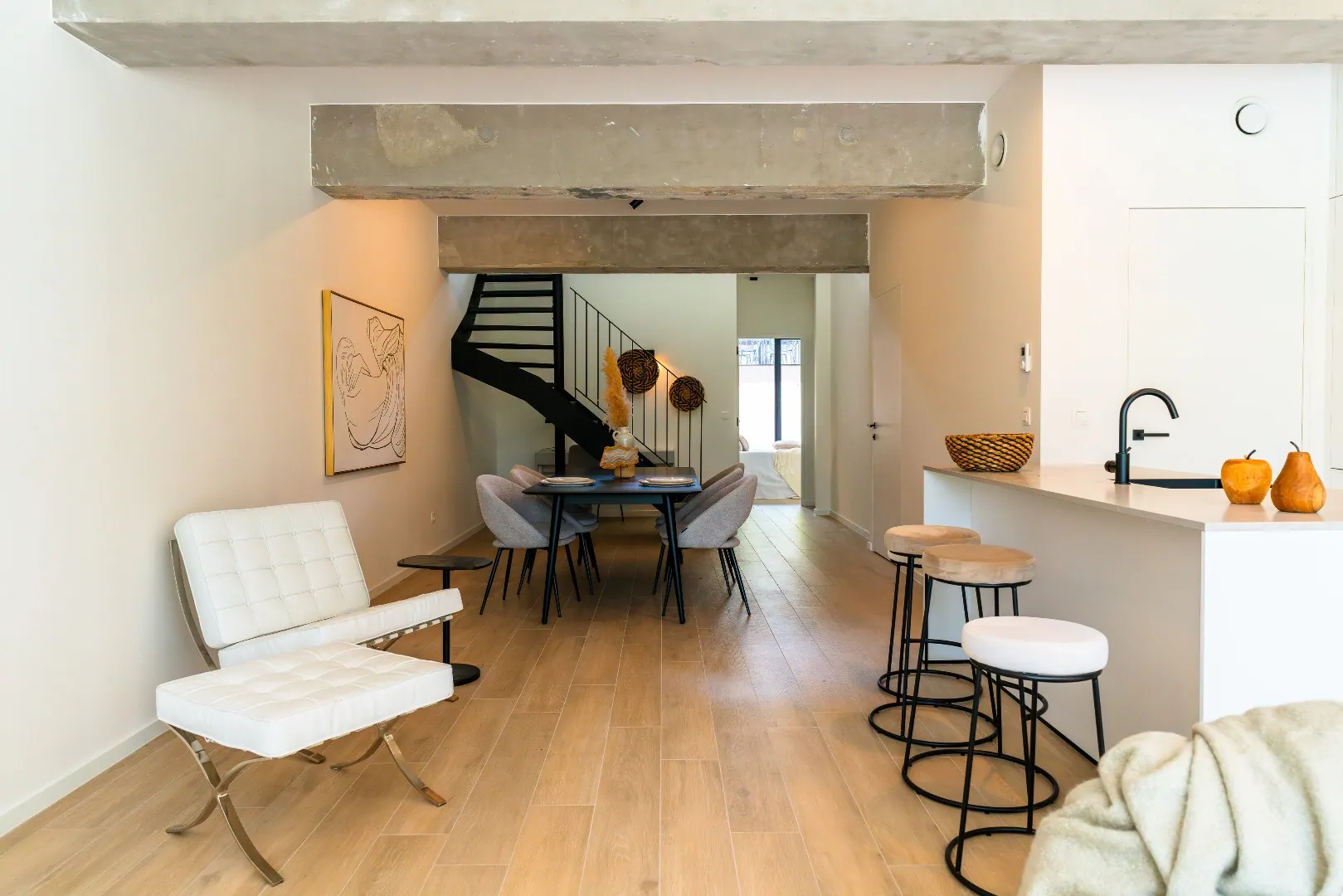 Een duplex of stadswoning is ingedeeld met een ruime woonkamer op het gelijkvloers. Hier is plaats voor een lichtrijke salon, eetkamer en open keuken. Naast de keuken is er een wasplaats. Verder zijn er gelijkvloers ook 2 slaapkamers mét terras, een badkamer en apart toilet. Via de open trap kom je op de belle-étage die uitkijkt op het prachtig groene paradeplein.