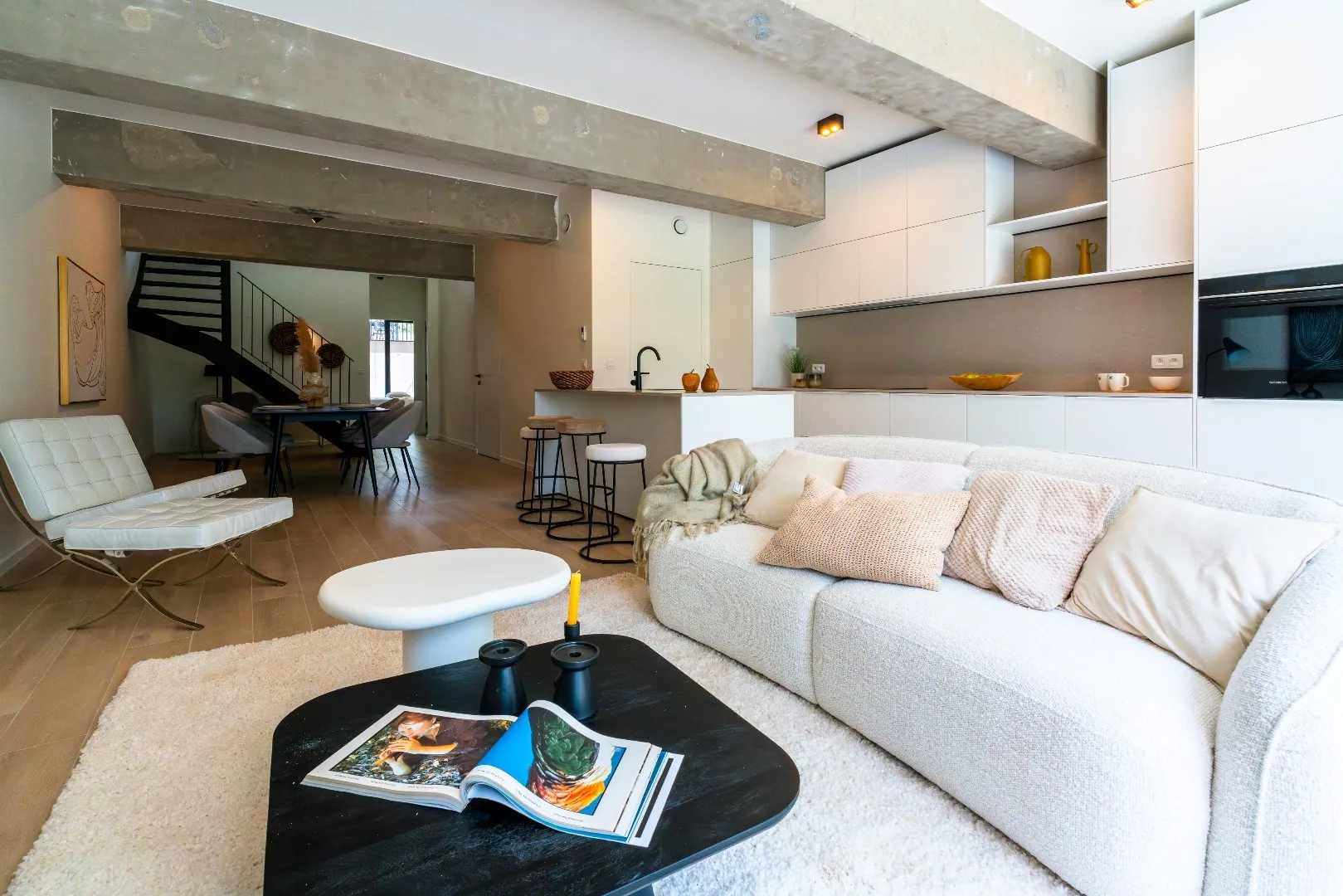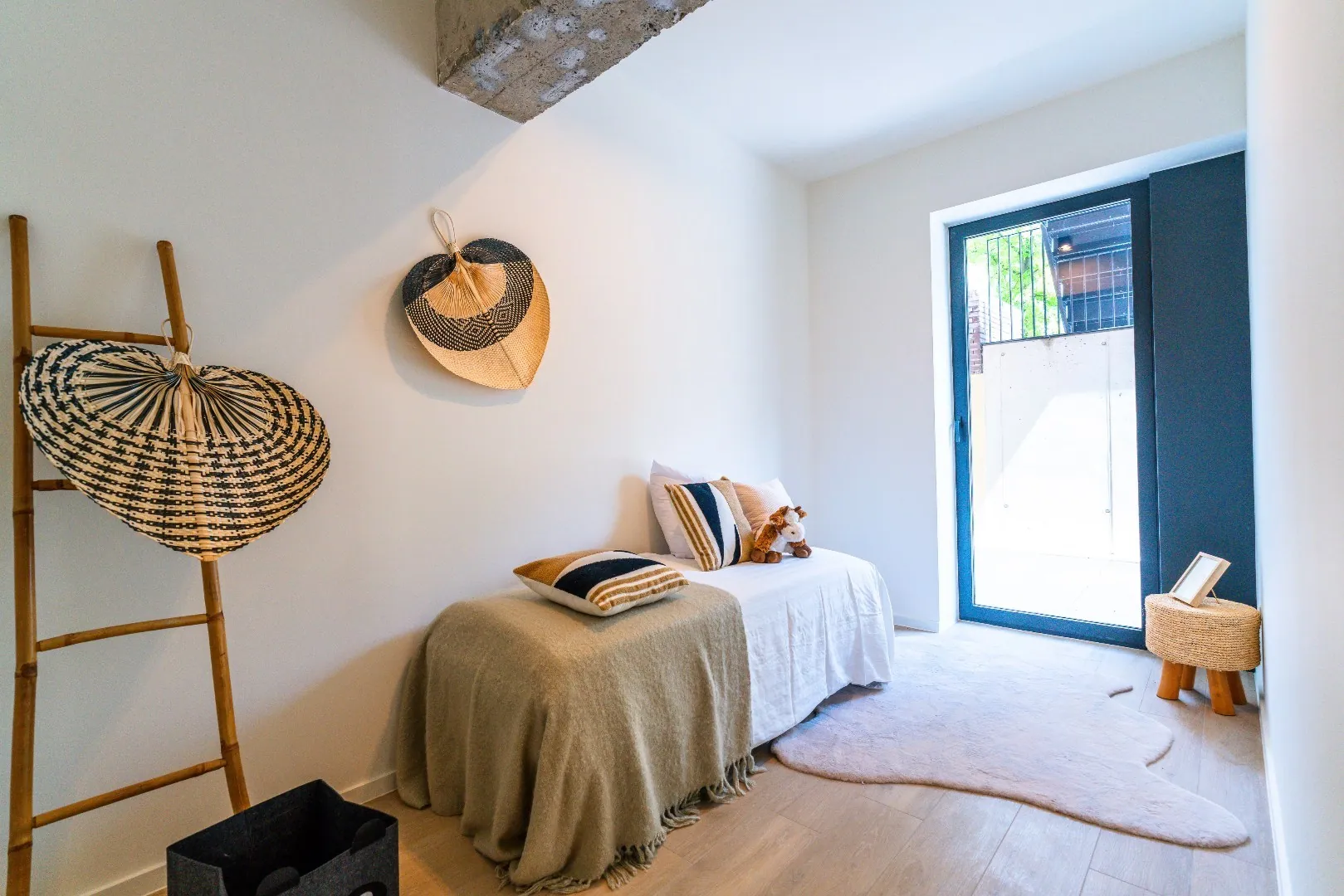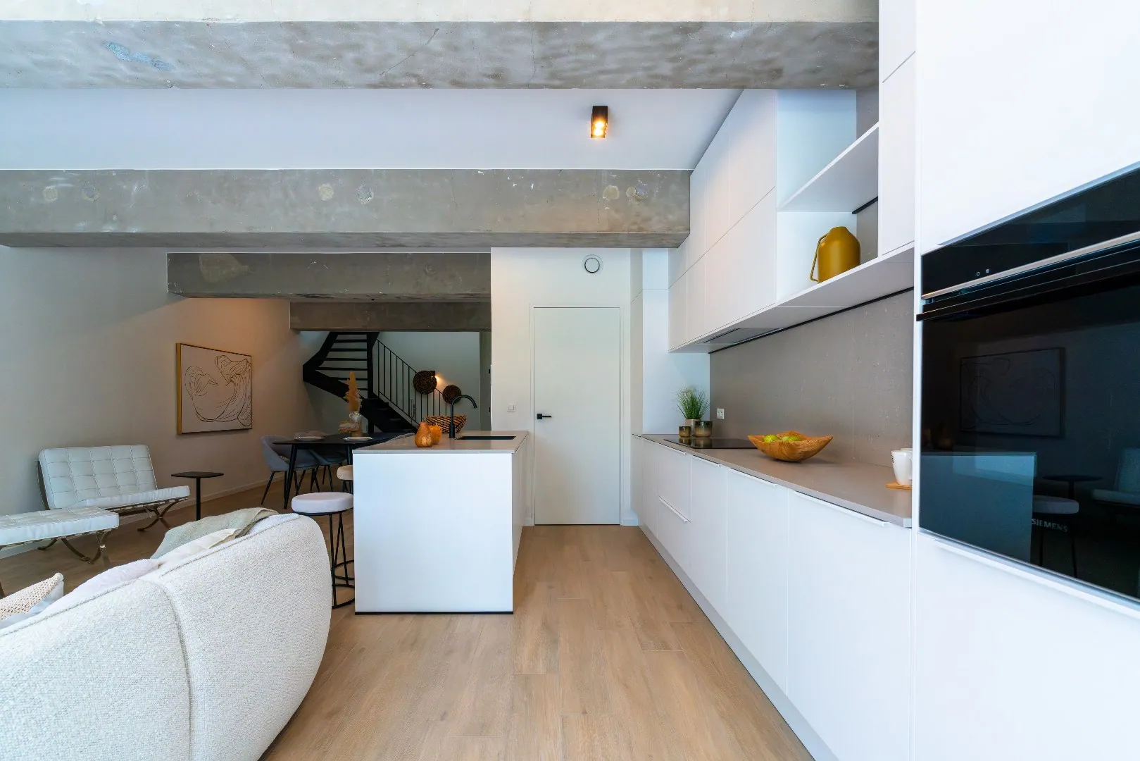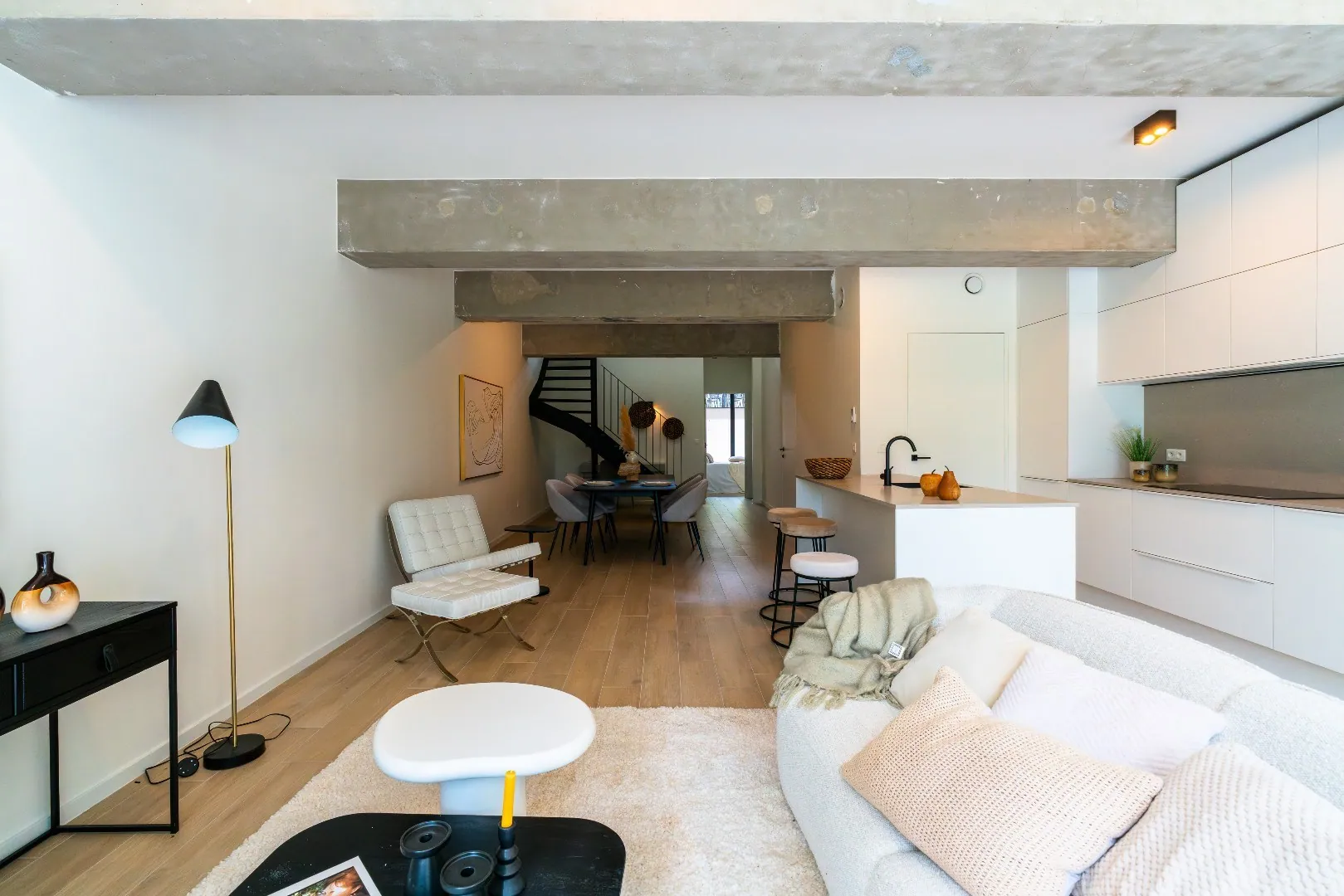 Een duplex of stadswoning is ingedeeld met een ruime woonkamer op het gelijkvloers. Hier is plaats voor een lichtrijke salon, eetkamer en open keuken. Naast de keuken is er een wasplaats. Verder zijn er gelijkvloers ook 2 slaapkamers mét terras, een badkamer en apart toilet. Via de open trap kom je op de belle-étage die uitkijkt op het prachtig groene paradeplein.