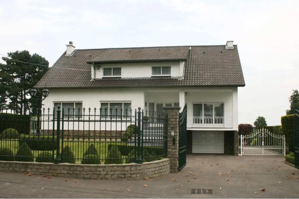 Het perceel is volledig omheind met sierhekwerk aan straatzijde, brede inrit met parking voor meerdere wagens en garage, en brede trappen in blauwe steen naar de inkom.