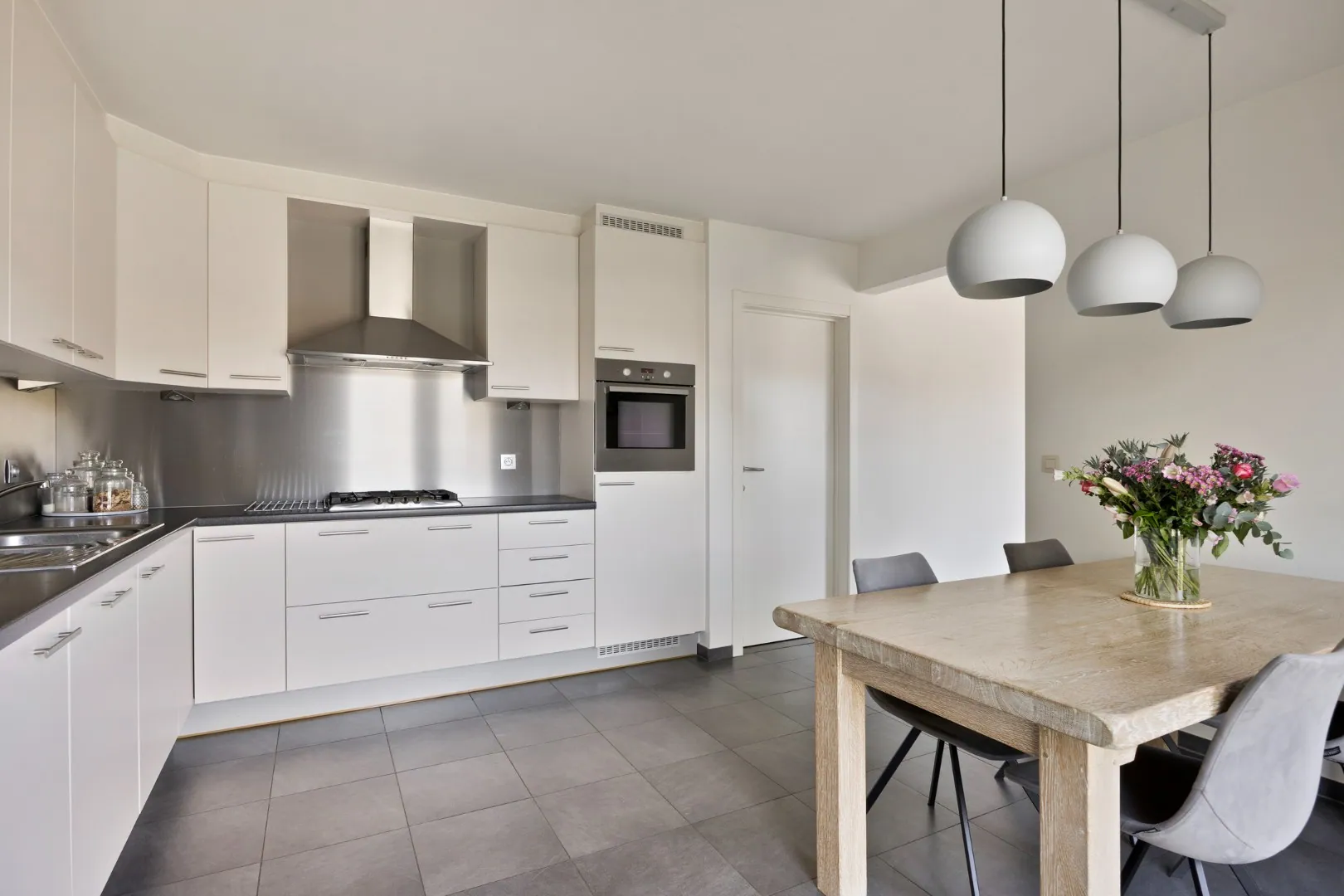 x open doorgang naar de ruime keuken, grote ramen naar de tuin zorgen ook hier voor aangename lichtinval en zicht op terras en tuin;