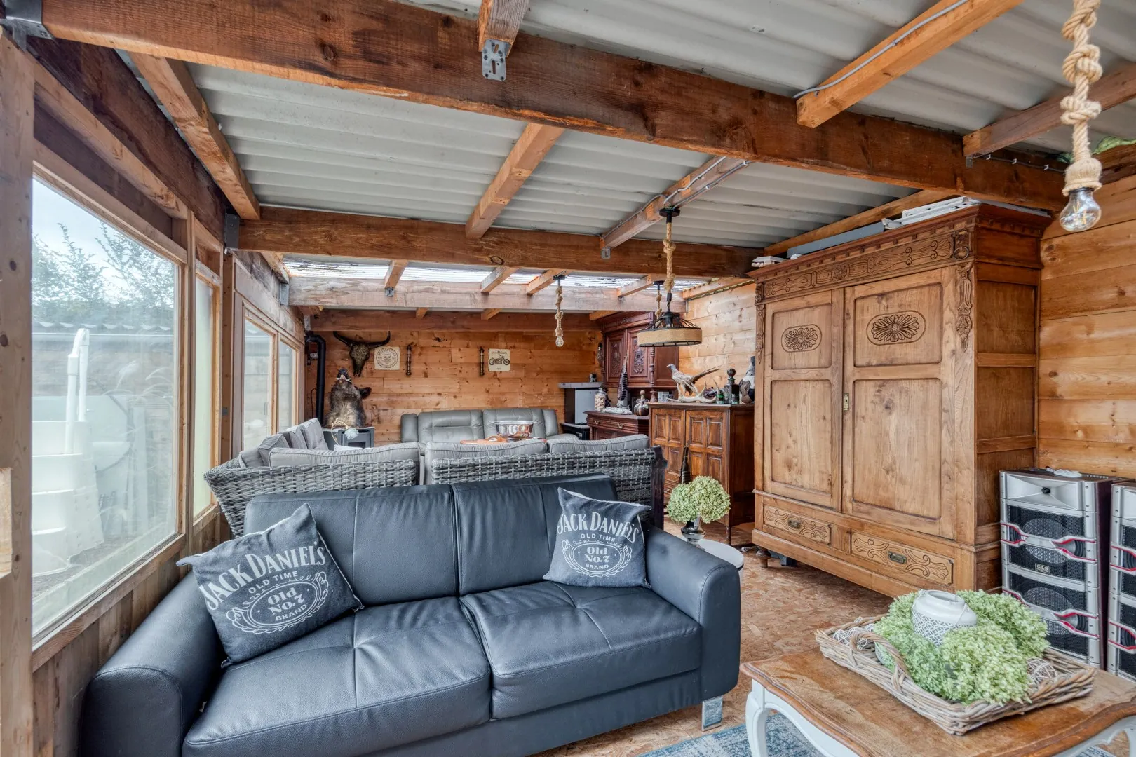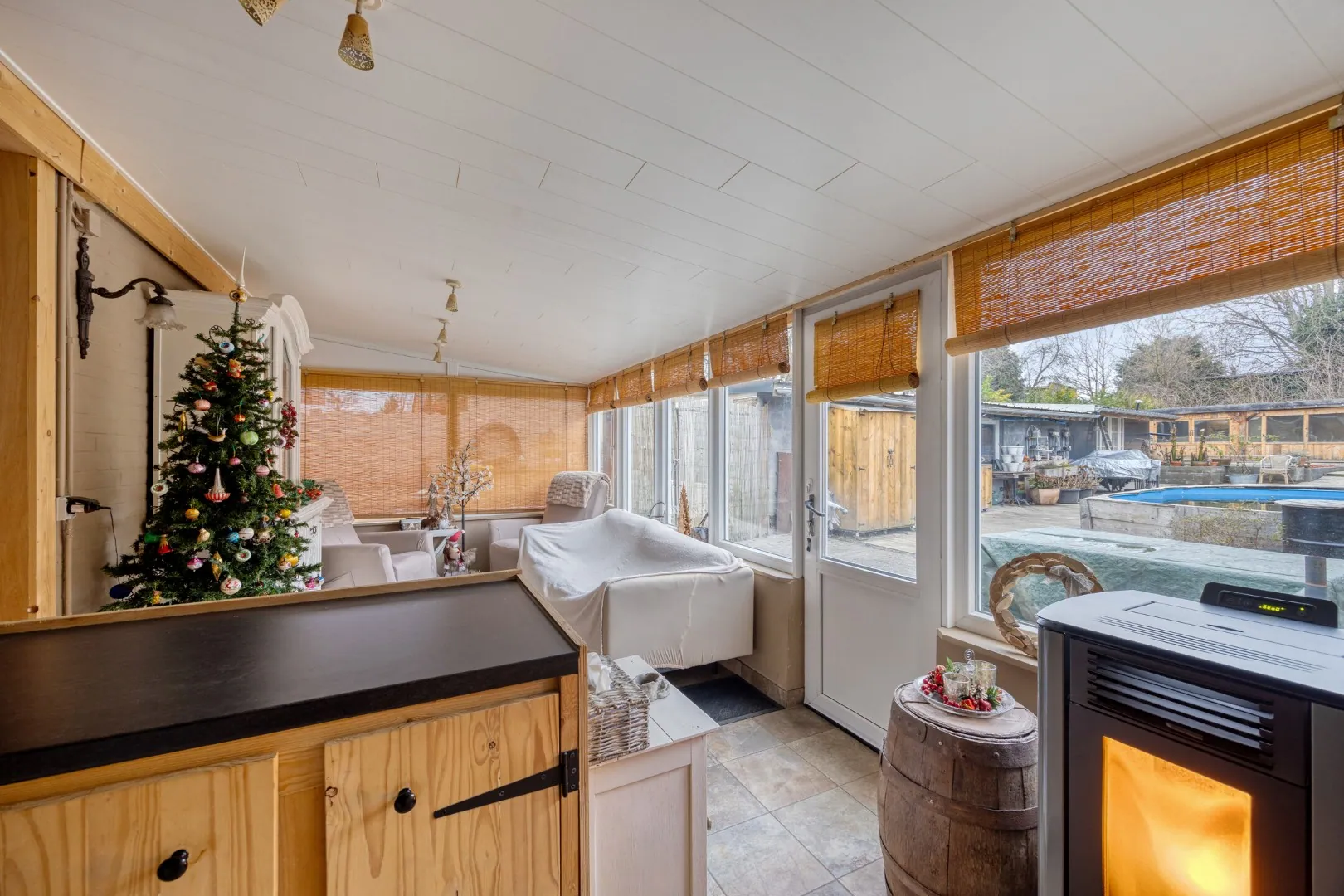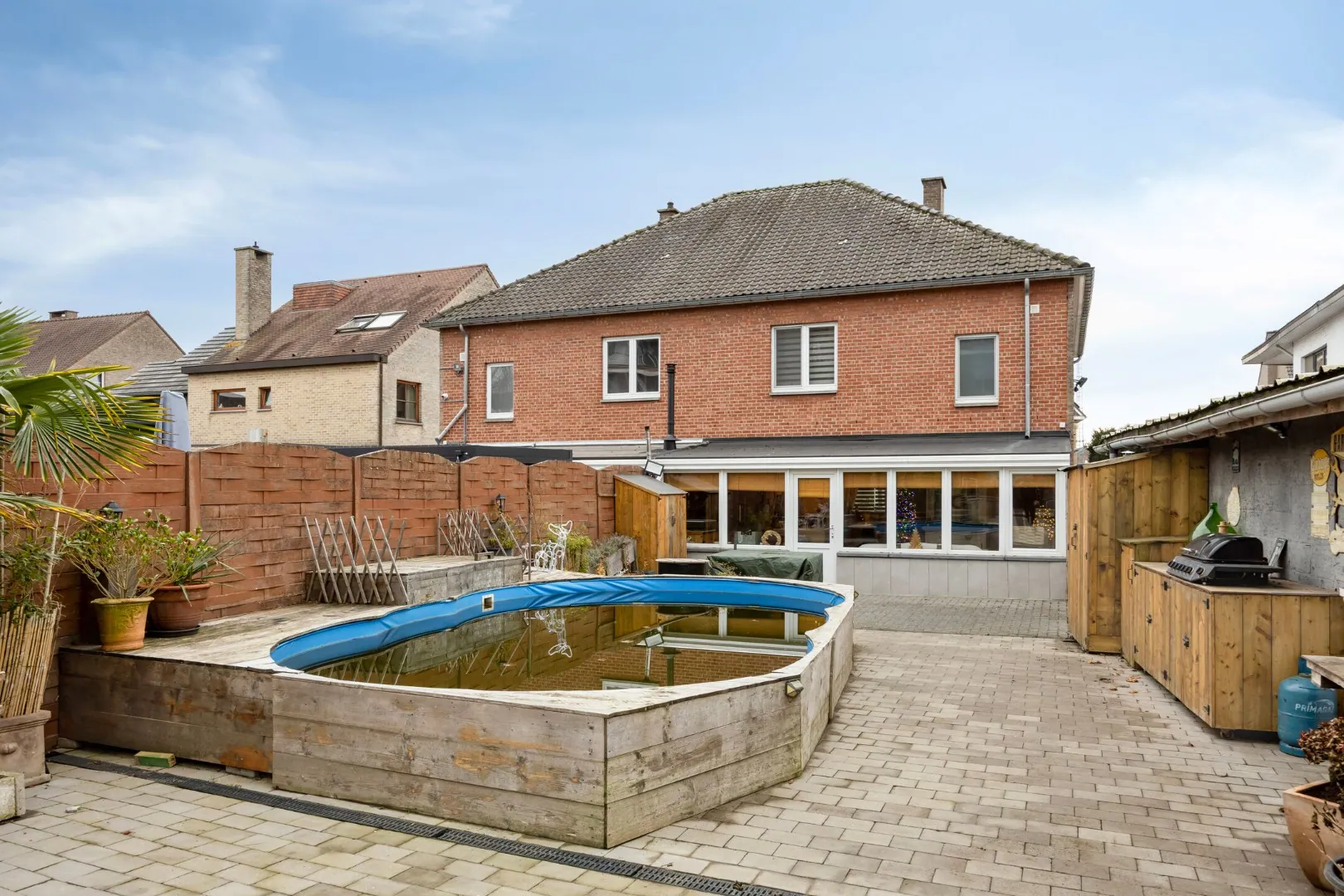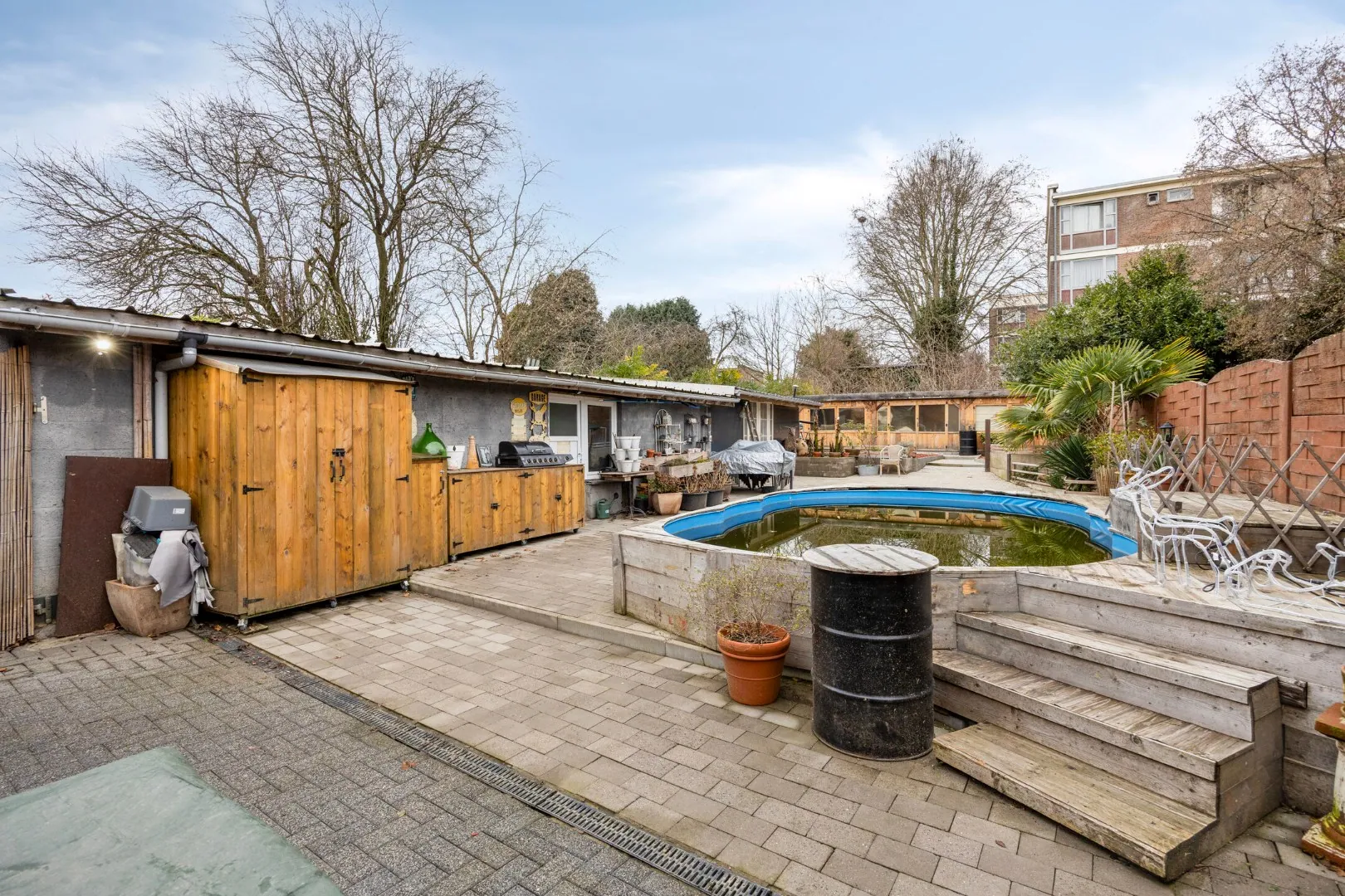 Achter de woning een groot terras met zwembad, buitenberging en achteraan een gezellige loungeruimte.