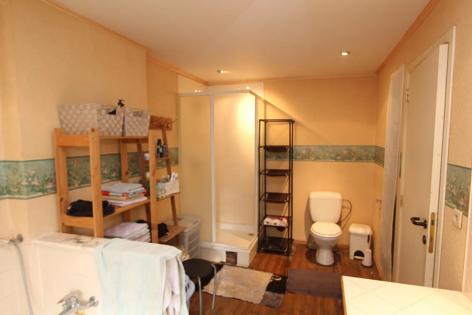 x badkamer met ligbad, douche en toilet.
