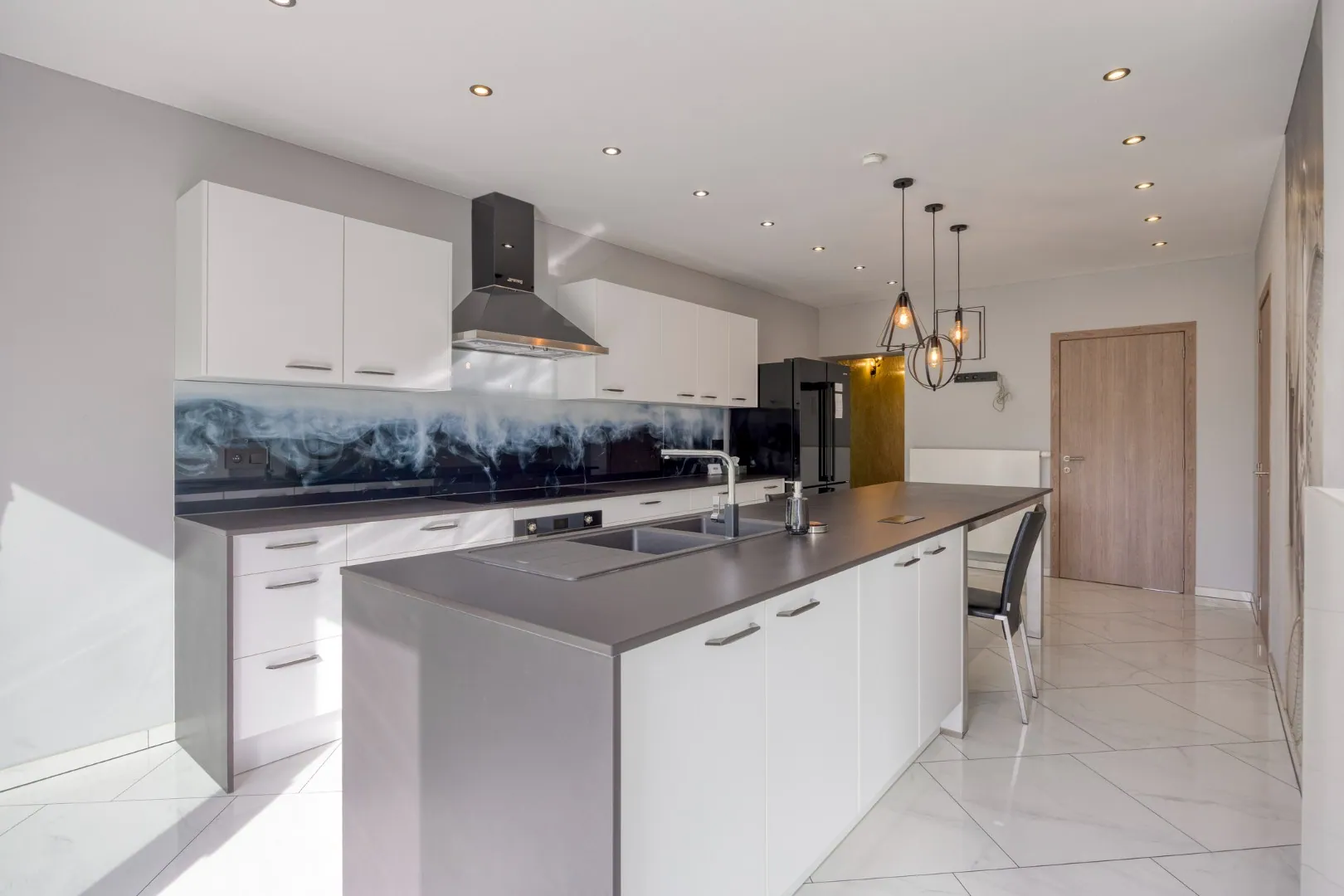 x ruime, goed ingerichte keuken met eiland, en een groot schuifraam naar het terras;