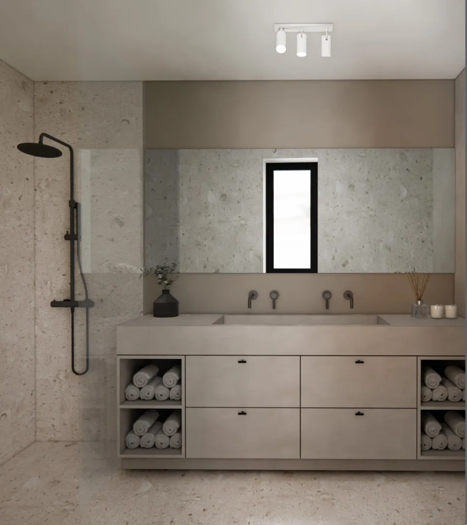| Raamwerk: | Het buitenschrijnwerk wordt uitgevoerd in aluminium of pvc, in een donkergrijze of zwarte kleur. |